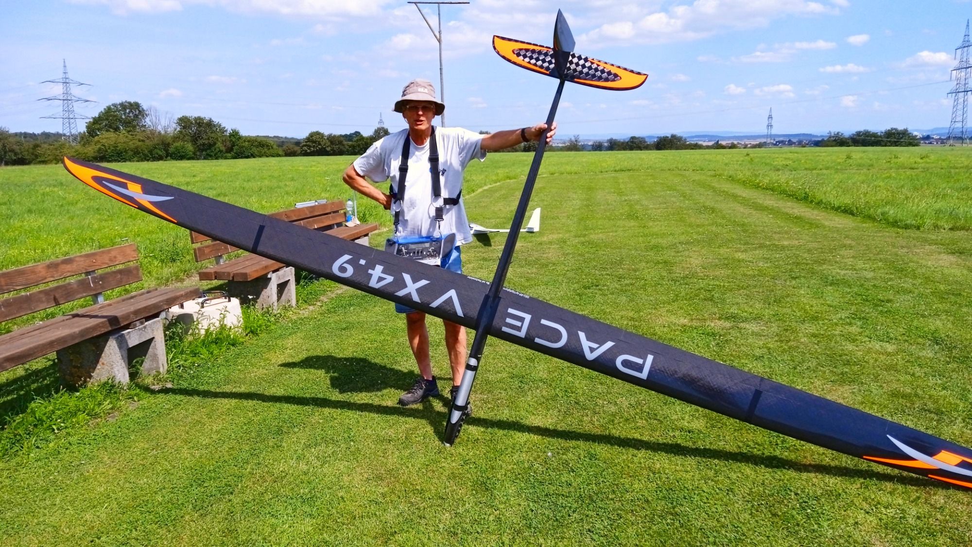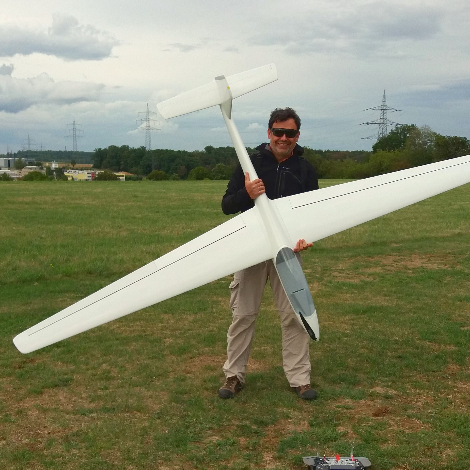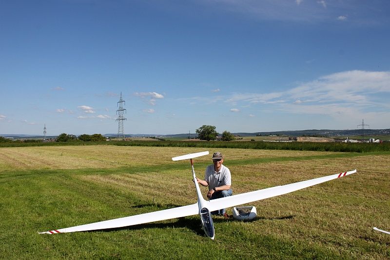 Gerd mit seiner neuen Thermikmaschine, die ELVIRA von PCM. 4,50m Spannweite, 5,2kg Fluggewicht (aufballastierbar auf 6,0kg), Vollkohle.