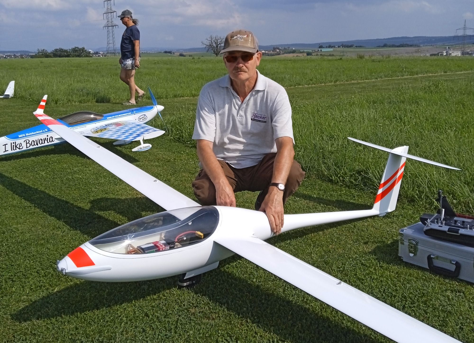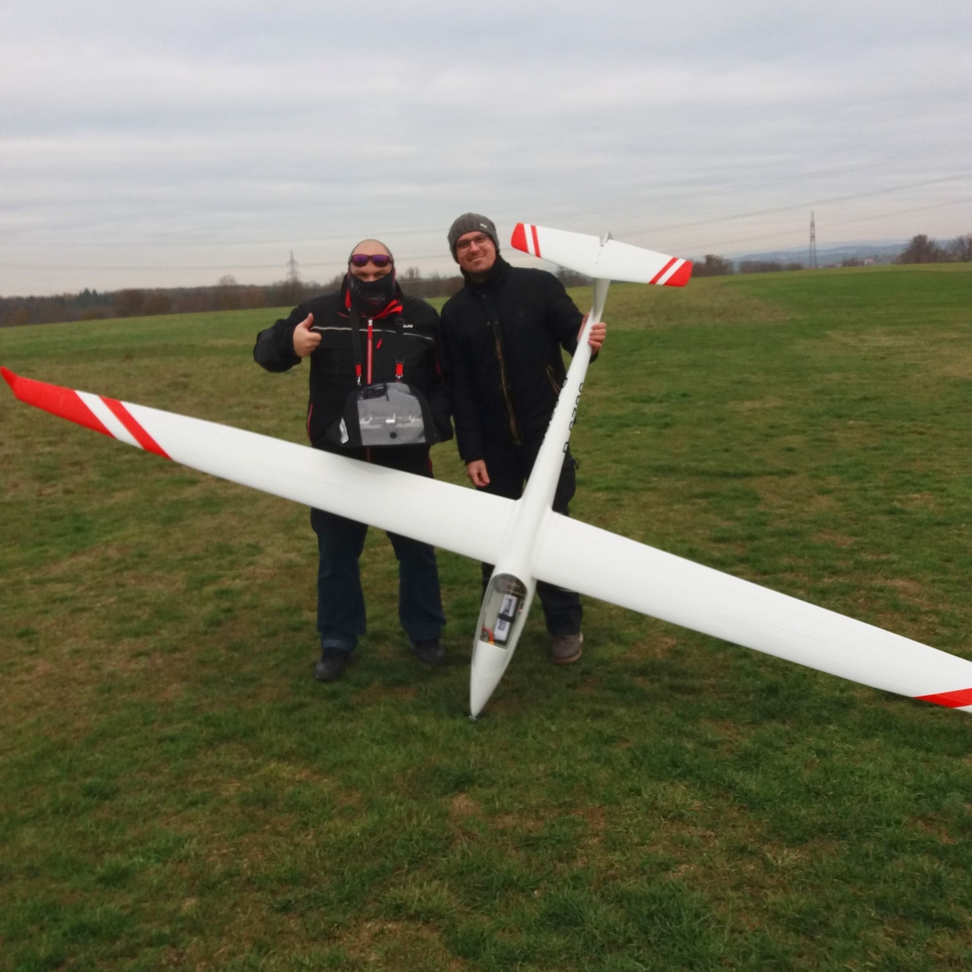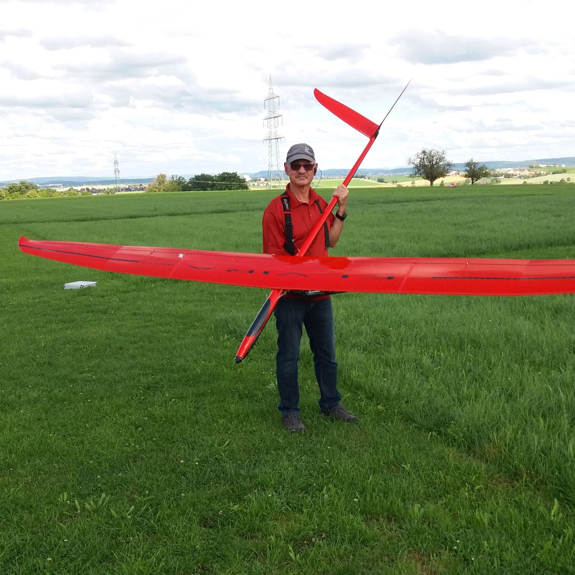 Gerd mit seiner neuen Thermikmaschine, die ELVIRA von PCM. 4,50m Spannweite, 5,2kg Fluggewicht (aufballastierbar auf 6,0kg), Vollkohle.